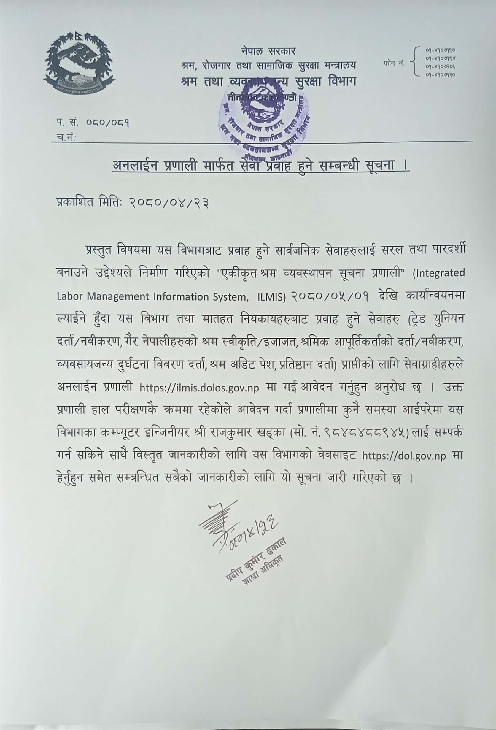 दरभाउ स्वीकृत गर्ने सम्बन्धी सूचनस श्रमिक आपूर्तिकर्ताको विवरण। व्यवसायजन्य रोगको सूची तोकेको सम्बन्धी । श्रमिकहरुको न्यूनतम पारिश्रमिक, सेवा सुविधाको दररेट कार्यान्वयन सम्वन्धी सूचना श्रम इजाजत सम्बन्धी विज्ञापन प्रकाशन सम्बन्धी सूचना श्रम अडिट पेश गर्ने सम्बन्धी सूचना। श्रम तथा व्यवसायजन्य सुरक्षा विभागले जारी गरेको मिति २०८२/०३/२७ को प्रेश विज्ञप्ति मिति २०८१-१२-१० को प्रेस विज्ञप्ति। श्रम तथा व्यवसायजन्य सुरक्षा विभागले मिति २०८१/१२/०८ मा जारी गरेको प्रेश विज्ञप्ति न्यूनतम पारिश्रमिक कार्यान्वयन सम्वन्धी सूचना। श्रमिक आपूर्तिकर्ता कम्पनिको ईजाजत तथा श्रमिकलाई लगाउन सकिने काम सम्बन्धी सूचना। श्रम अडिट गर्ने सम्बन्धी सूचना। बालश्रम निवारण सम्बन्धी सूचना। व्यवसायजन्य सुरक्षा तथा स्वास्थ्यको अभ्यास र व्यवस्थापन सम्बन्धी सूचना। सामाजिक सुरक्षाकोषमा योगदान सम्बन्धी सूचना। न्यूनतम पारिश्रमिक लगायत श्रम ऐन कार्यान्वयव बारे सूचना। श्रमाधान कल सेन्टर तथा यस सँग सम्बन्धित जानकारीमूलक सामाग्रीको QR Code