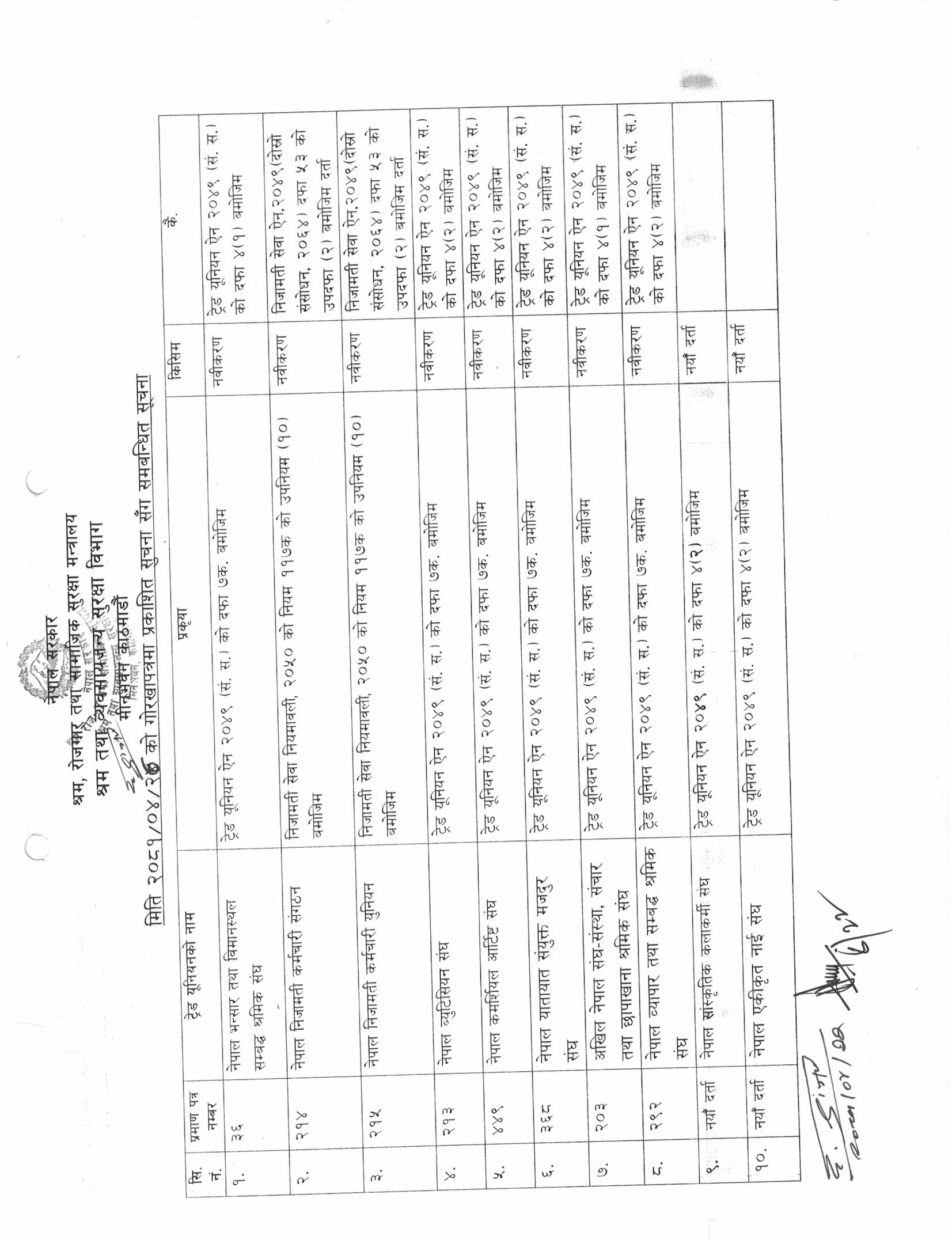 दरभाउ स्वीकृत गर्ने सम्बन्धी सूचनस श्रमिक आपूर्तिकर्ताको विवरण। व्यवसायजन्य रोगको सूची तोकेको सम्बन्धी । श्रमिकहरुको न्यूनतम पारिश्रमिक, सेवा सुविधाको दररेट कार्यान्वयन सम्वन्धी सूचना श्रम इजाजत सम्बन्धी विज्ञापन प्रकाशन सम्बन्धी सूचना श्रम अडिट पेश गर्ने सम्बन्धी सूचना। श्रम तथा व्यवसायजन्य सुरक्षा विभागले जारी गरेको मिति २०८२/०३/२७ को प्रेश विज्ञप्ति मिति २०८१-१२-१० को प्रेस विज्ञप्ति। श्रम तथा व्यवसायजन्य सुरक्षा विभागले मिति २०८१/१२/०८ मा जारी गरेको प्रेश विज्ञप्ति न्यूनतम पारिश्रमिक कार्यान्वयन सम्वन्धी सूचना। श्रमिक आपूर्तिकर्ता कम्पनिको ईजाजत तथा श्रमिकलाई लगाउन सकिने काम सम्बन्धी सूचना। श्रम अडिट गर्ने सम्बन्धी सूचना। बालश्रम निवारण सम्बन्धी सूचना। व्यवसायजन्य सुरक्षा तथा स्वास्थ्यको अभ्यास र व्यवस्थापन सम्बन्धी सूचना। सामाजिक सुरक्षाकोषमा योगदान सम्बन्धी सूचना। न्यूनतम पारिश्रमिक लगायत श्रम ऐन कार्यान्वयव बारे सूचना। श्रमाधान कल सेन्टर तथा यस सँग सम्बन्धित जानकारीमूलक सामाग्रीको QR Code
